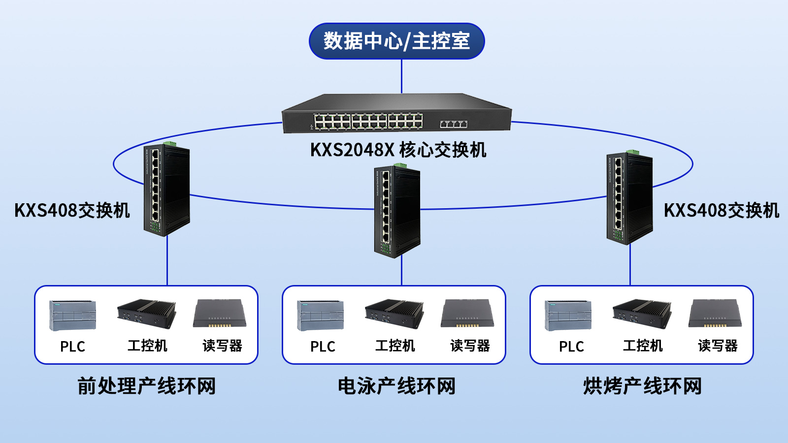 ·核心层:设在工厂数据中心或主控室,使用KXS2048X万兆交换机,作为整个产线网络的出口和数据处理中心。