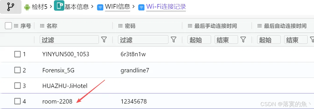 1.分析检材找出其出差时连接过的房间wifi,并以此wifi密码作为flag提交