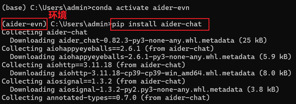 在下载aider-chat时注意环境的进入与否。当前面的base变成环境名时,就说明已经能够正确进入了。
