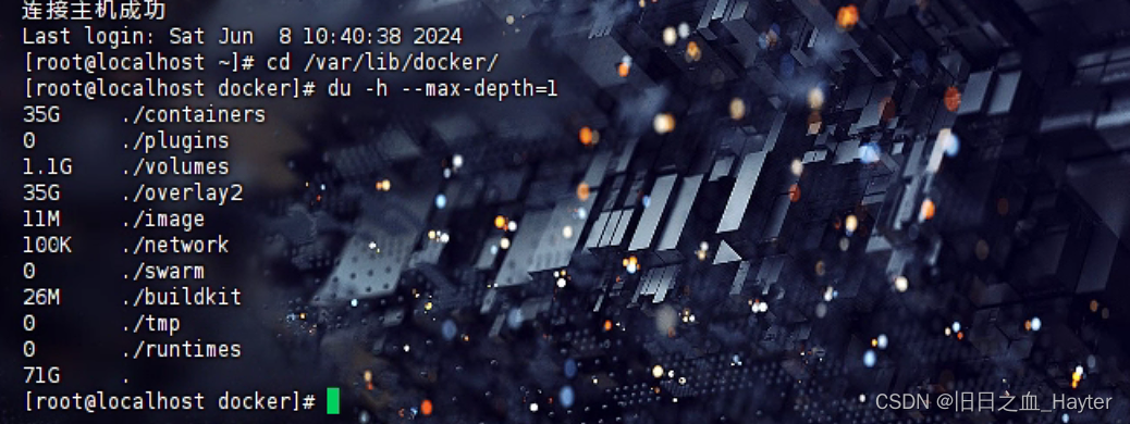 今天在启动项目的时候,发现启动不起来,提示Redis连不上。看了一下发现是磁盘满了而且OverLay2文件夹也快满了于是得想想办法解决。