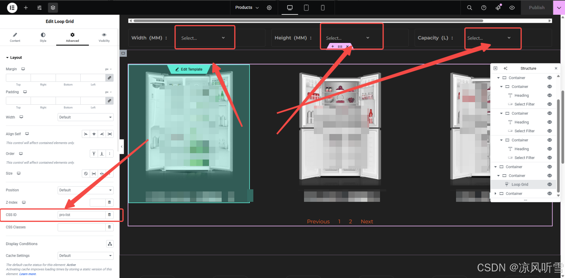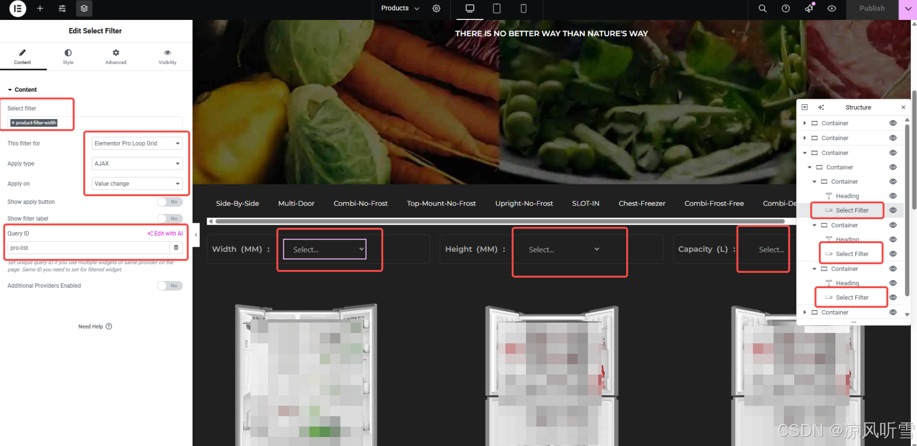 选择对应的select filter,配置对应参数,Query ID需要注意,这里绑定的ID是下面product list组件的ID,不然此处的参数无法传递给list使用,也就无法成功筛选对应属性的产品。至于该模块的样式请自行调试,笔者此处只写明了功能实现步骤。