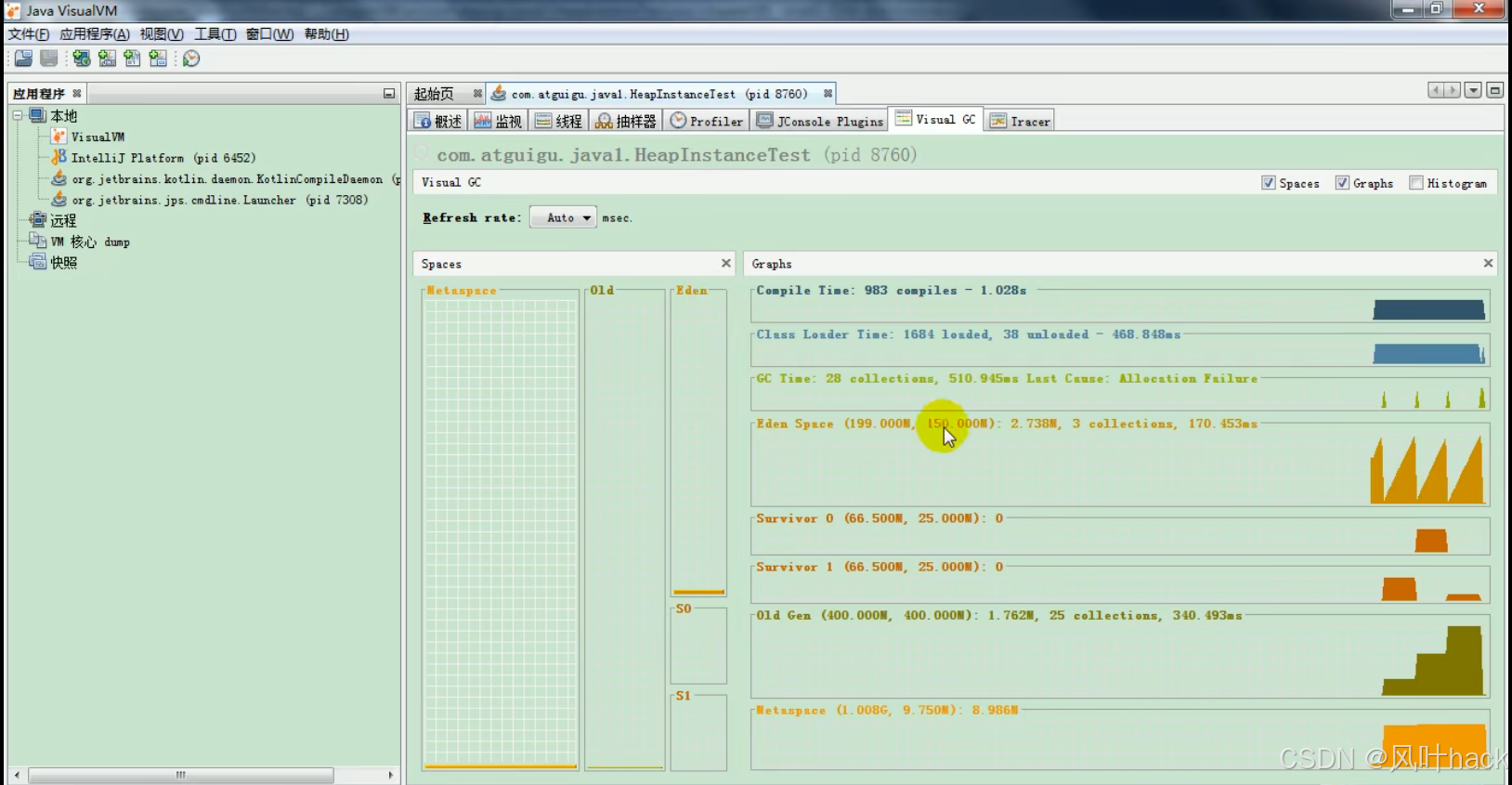 - 线程每秒产生60MB对象,新生代Eden区800M→约14秒填满Eden,触发Minor GC(新生代GC,停顿短);