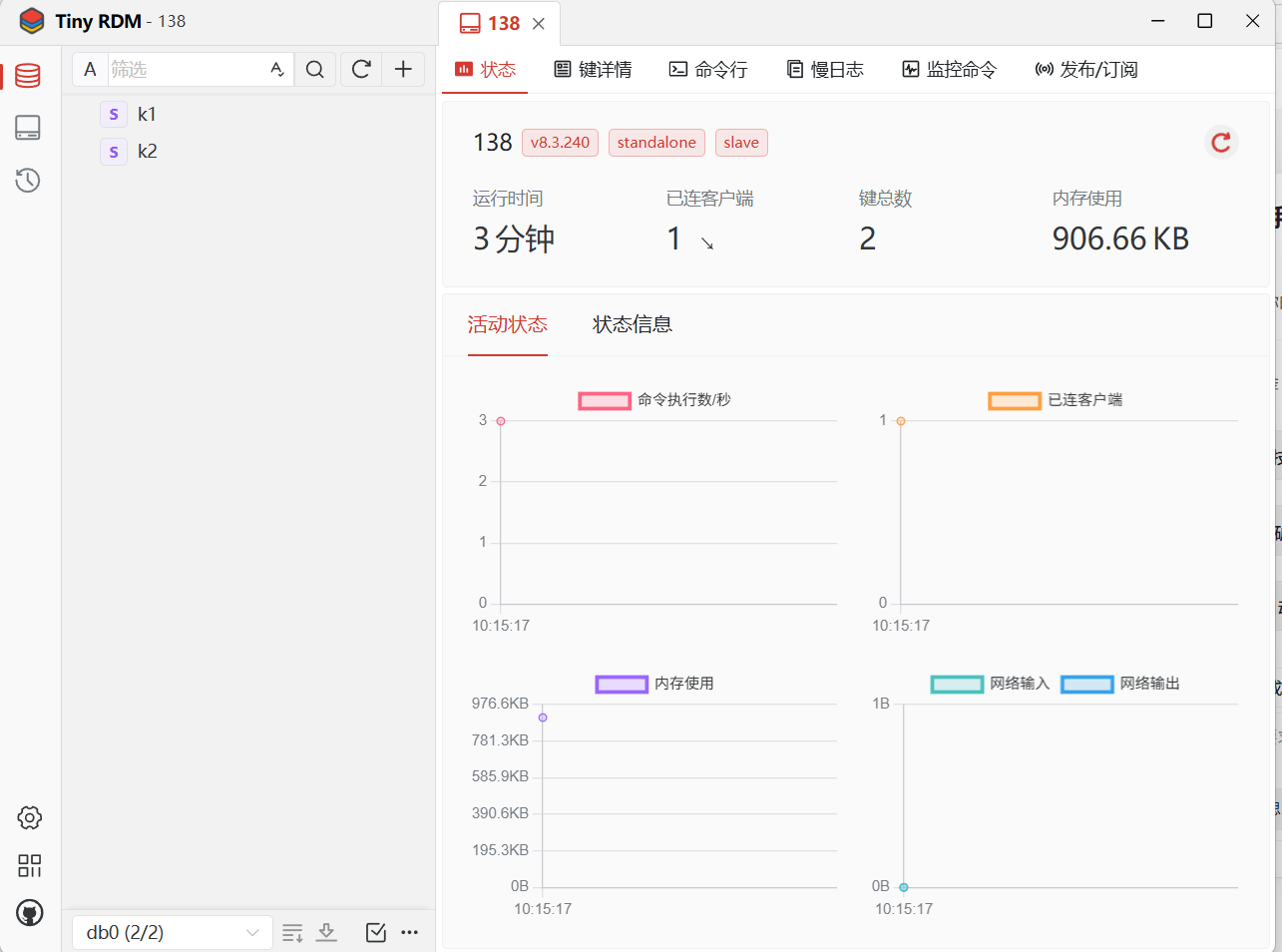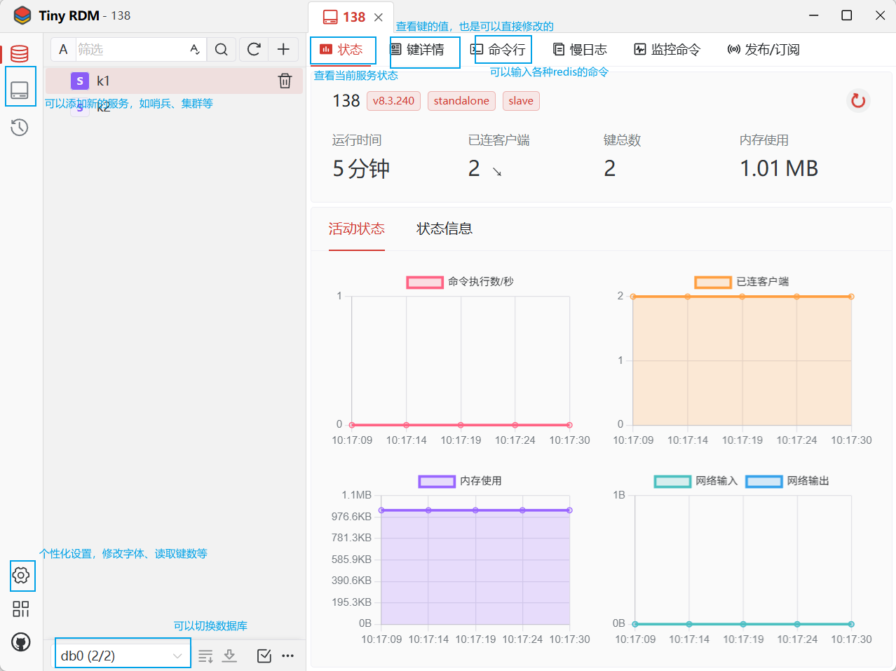 这是主页面,在该页面可以发现,它使用的是db0,redis默认有16各数据库;旁边可以查看cpu占用等一些系统参数;可以通过类型查,也可以通过名字来查;点击k1,可以直接在这修改他的值。