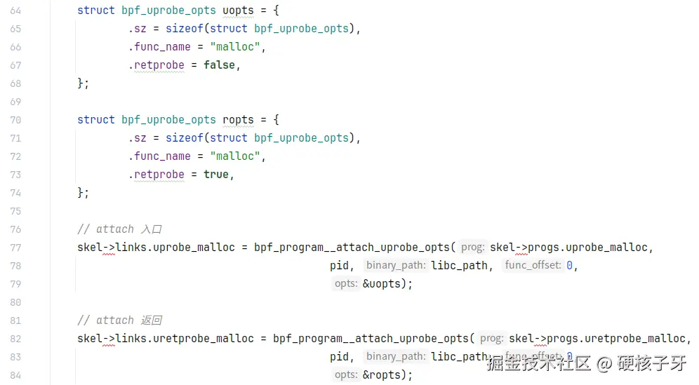 第一个问题,执行malloc函数,是如何执行到uprobe的?采用插桩的方式。核心代码长这样