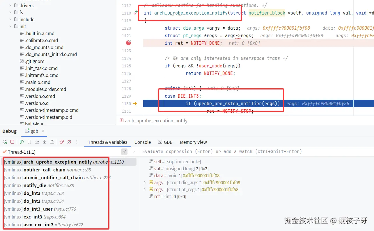 其实Linux内核也没做区分,Linux内核中有个die_notifier链,3号异常来了,先丢给优先级最高的notifier处理,ebpf插桩的优先级比gdb断点要高