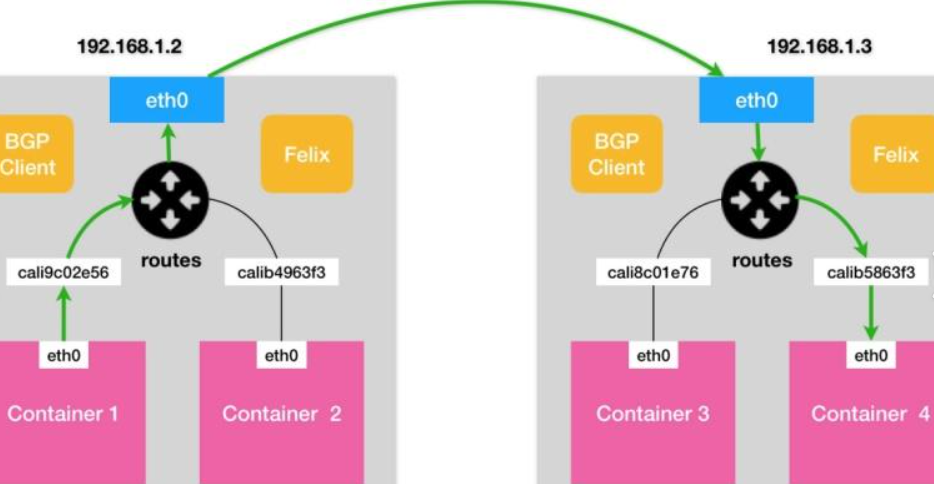 原理:pod1访问pod2,pod1位于node1节点中,pod2位于node2节点中,pod将数据写入数据包发送给pod1的网卡eth0,eth0再通过网桥将数据包发送给node1节点的网卡,node1查找路由规则,BGP为node1找出转发的最佳路径,node1通过自己的物理网卡将数据包发送到对端的node2网卡,node2查找路由表发现有pod2后,将包发给pod2。