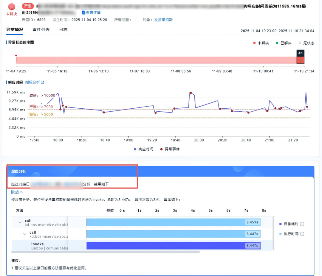 依托优质日志记录、详尽的系统监控数据及预设排查流程,在温氏商城出现访问缓慢、种猪宝 APP 接口报错、云苍穹平台数据库异常等故障时,可迅速查阅相关文档资源初步推测问题原因;同时借助接口调用链追踪、用户会话回放等能力,直观呈现慢接口耗时节点、识别错误代码执行环节,5分钟内完成故障精准定位,摆脱传统运维对人工经验的依赖。