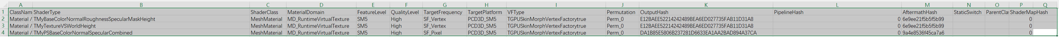 | ClassNameAndObjectPath | ShaderType | ShaderClass | MaterialDomain | FeatureLevel | QualityLevel | TargetFrequency | TargetPlatform | VFType | Permutation | OutputHash | PipelineHash | AftermathHash | StaticSwitch | ParentClassNameAndObjectPath | ShaderMapHash ||