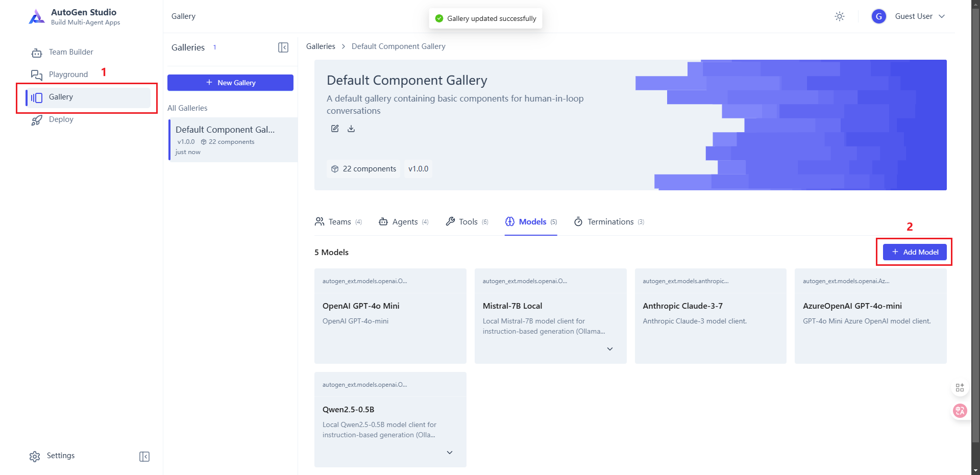 启动 AutoGenStudio 后访问 Web Ui 界面,点击Gallery菜单,再点击 +Add Model按钮: