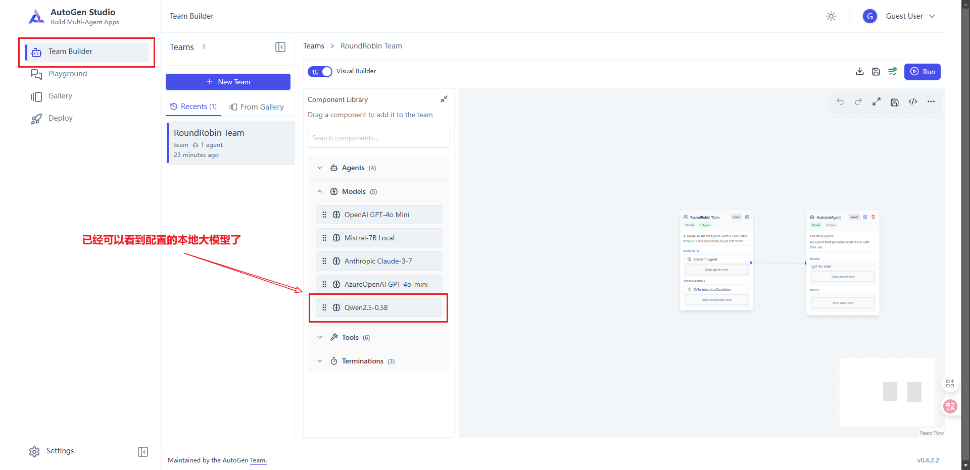 点击Team Builder菜单,再点击 Models就可以看到新增的本地大模型: