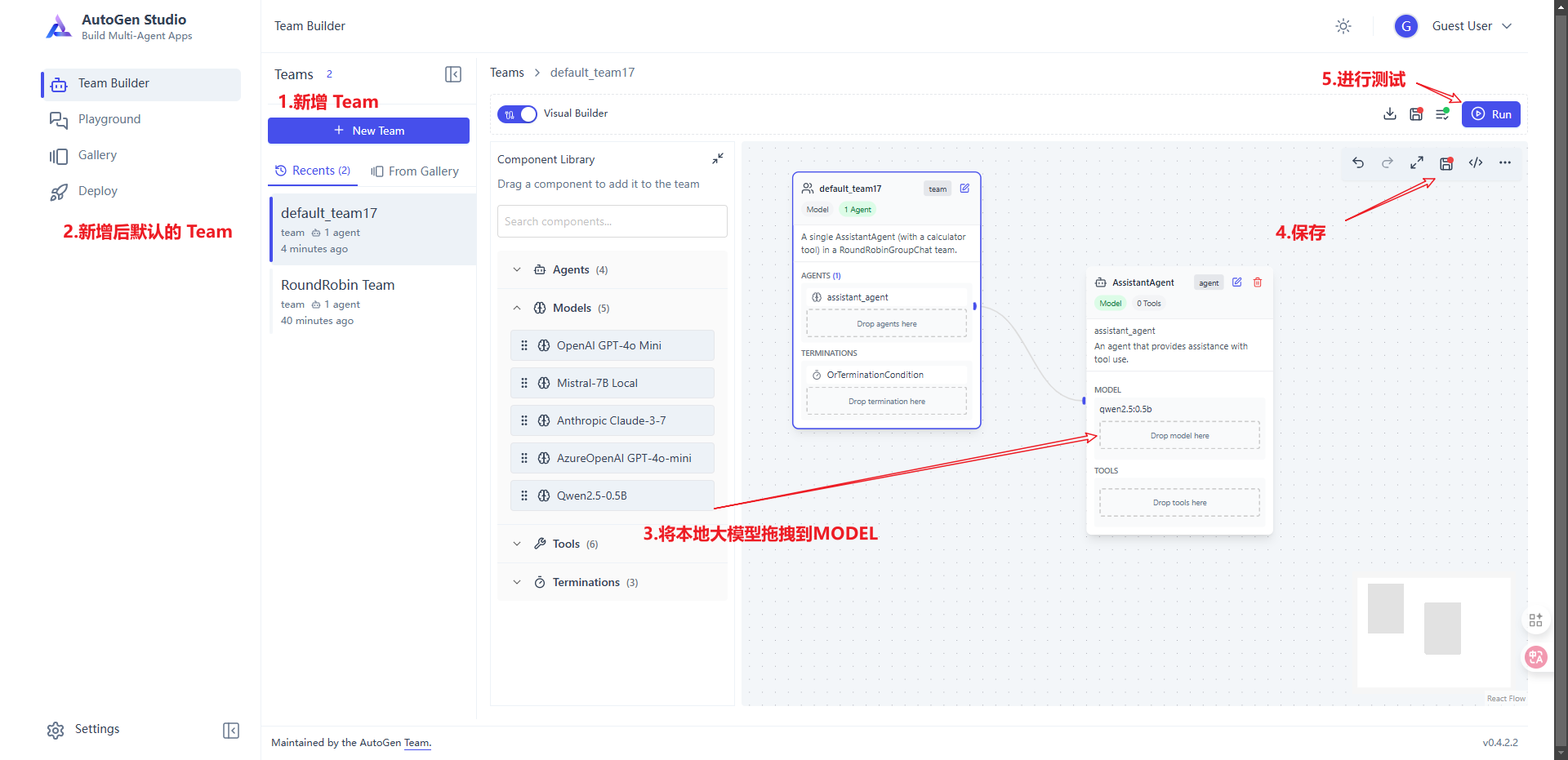 点击 + New Team新增 Team 后会生成默认的 Team 模版,将配置的本地大模型拖拽到 MODEL 下替换原有的模型,保存后,点击 Run按钮进行测试: