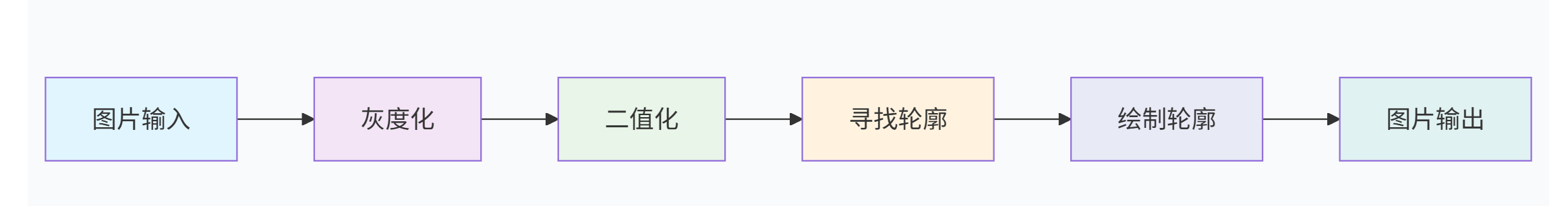 图片输入 → 灰度化 → 二值化 → 寻找轮廓 → 绘制轮廓 → 图片输出