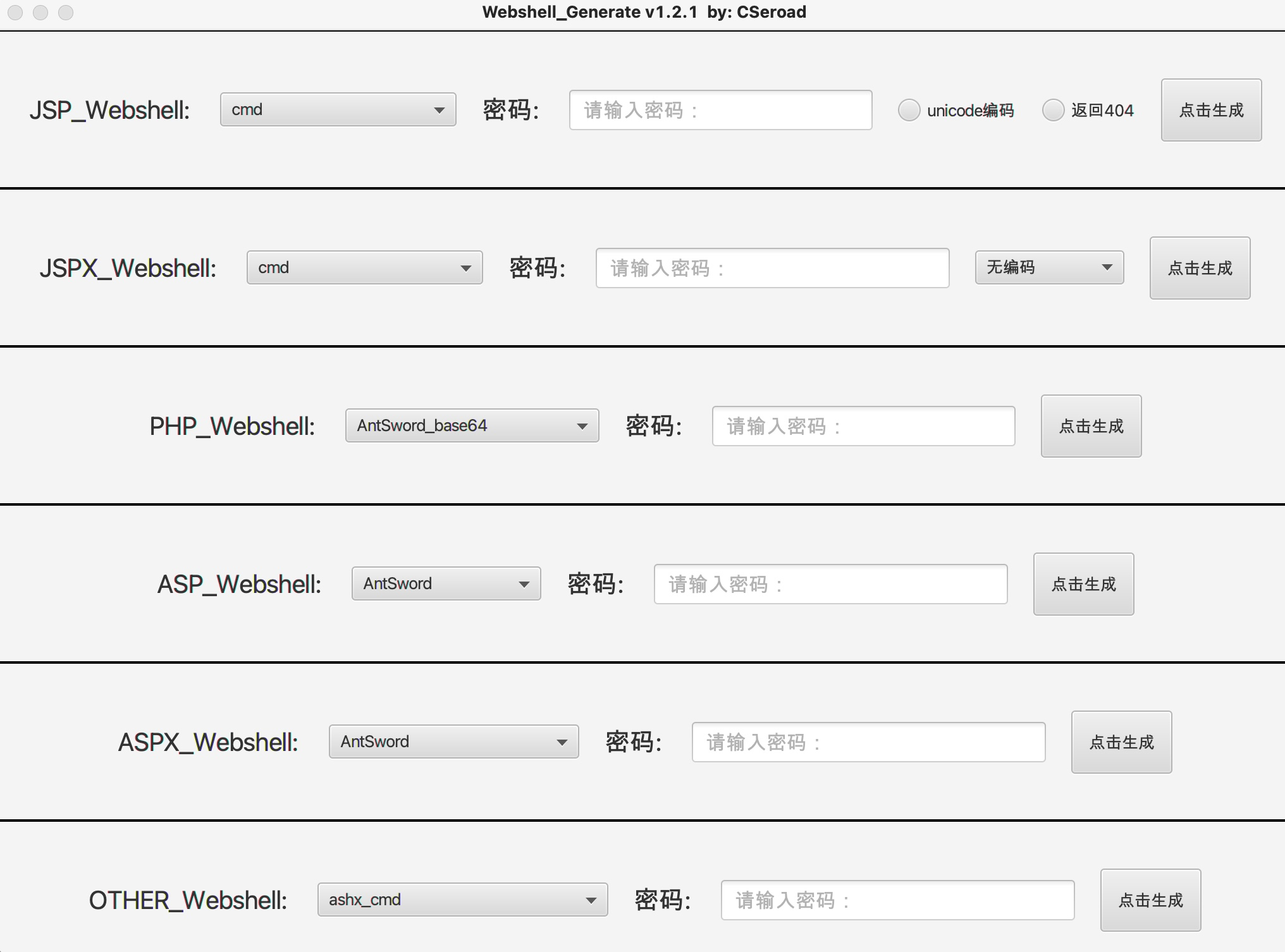 Webshell_Generate该工具没什么技术含量,学了一点javafx,使用jdk8开发出了几个简单功能用来管理webshell。页面比较low。