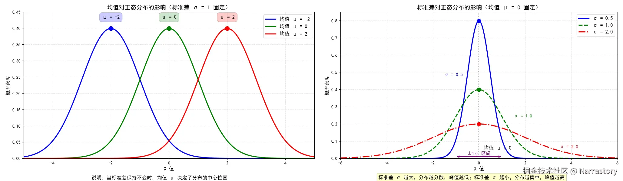 具体来说, <math xmlns="http://www.w3.org/1998/Math/MathML"> σ \sigma </math>σ 越大,曲线越"矮胖",数据越分散; <math xmlns="http://www.w3.org/1998/Math/MathML"> σ \sigma </math>σ 越小,曲线越"高瘦",数据越集中。下图直观展示了对不同 <math xmlns="http://www.w3.org/1998/Math/MathML"> μ \mu </math>μ 和 <math xmlns="http://www.w3.org/1998/Math/MathML"> σ \sigma </math>σ 时分布形态的变化: