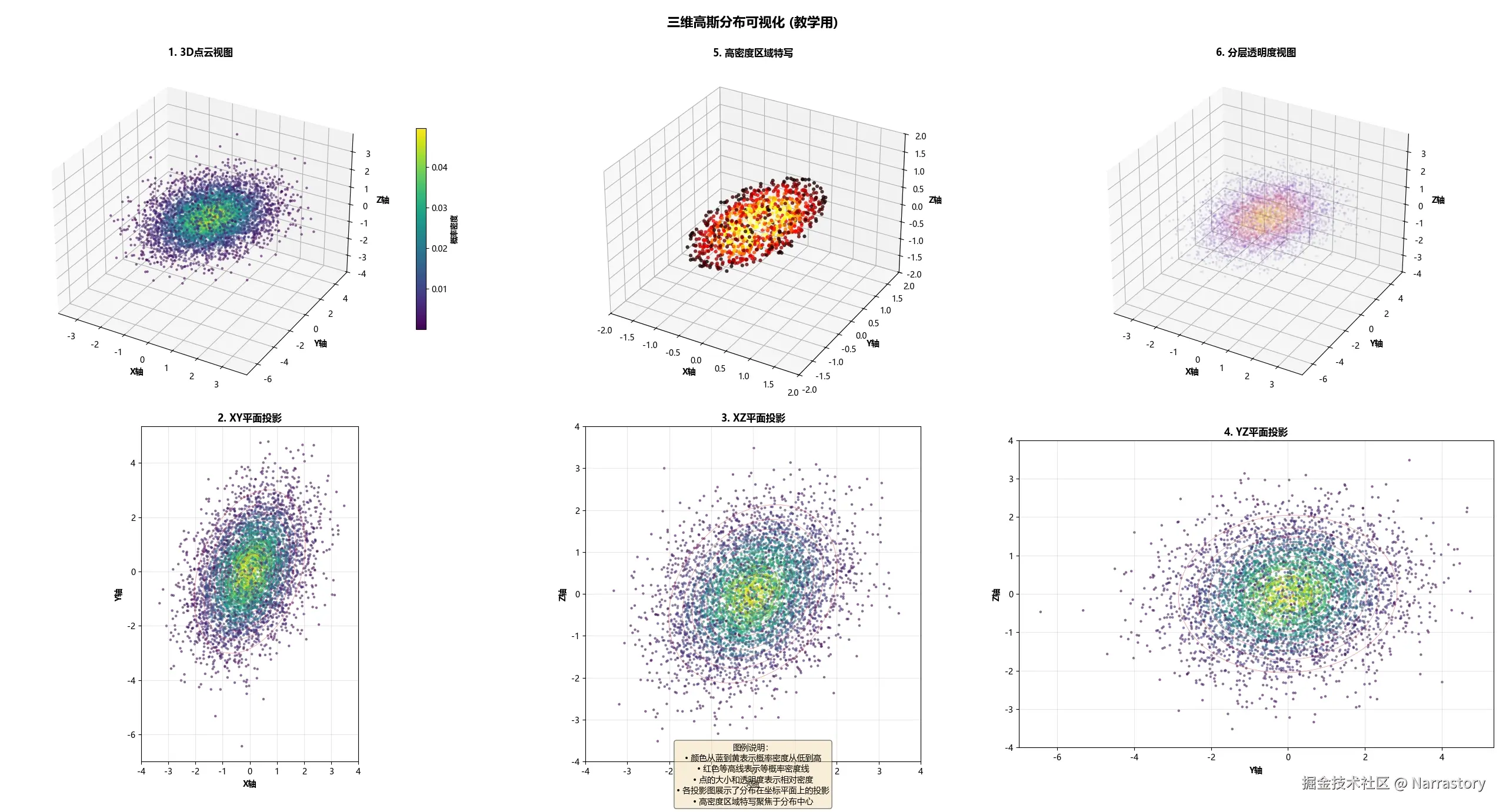 对于三维高斯分布,在三维空间中完整可视化概率密度函数较为困难,因此常用三维点云图来近似表示其分布形态。在下图中,每个点的位置代表一个三维样本,颜色或密度表示该点出现的概率大小。可以看到,样本点密集地分布在均值点附近,并随着距离增加而逐渐稀疏,整体形状大致呈椭球状。这个椭球的朝向与伸展程度,完全由三维协方差矩阵的特征向量和特征值决定。