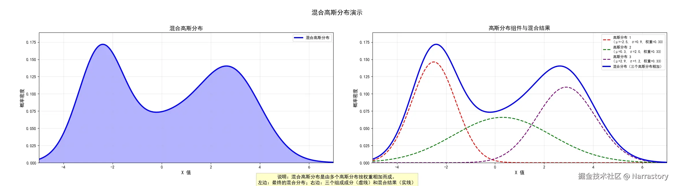 其中, <math xmlns="http://www.w3.org/1998/Math/MathML"> N ( x ∣ μ , σ ) \mathcal{N}(x \mid \mu,\sigma) </math>N(x∣μ,σ)表示均值为 <math xmlns="http://www.w3.org/1998/Math/MathML"> μ \mu </math>μ,标准差为 <math xmlns="http://www.w3.org/1998/Math/MathML"> σ \sigma </math>σ的高斯分布概率密度函数。下图直观展示了这三个高斯分量(虚线)以及它们叠加后的总密度函数(蓝色实线)