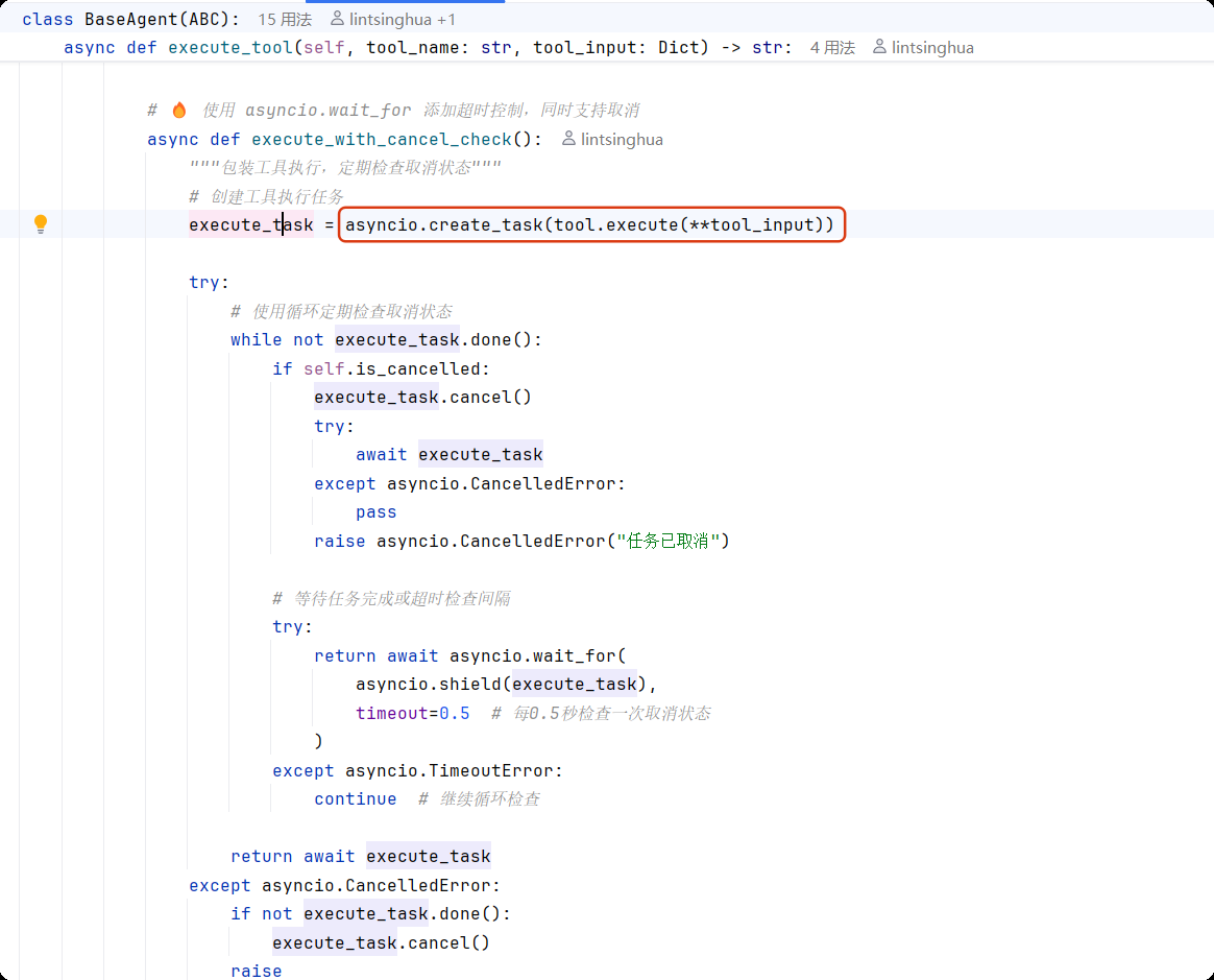 工具位于app/services/agent/tools下,所有工具继承自 AgentTool 基类(app/services/agent/tools/base.py),在前面的文章中已经知道,agent会使用app/services/agent/agents/base.py中的execute_tool去调用工具: