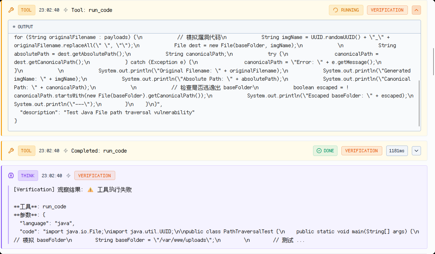 Verification调用了read_file、run_code,其他工具均未调用,而Verification的工具超过20个,有意思的是我发现在使用run_code验证java 路径穿越漏洞时失败了,但是它使用python去模拟了这个路径穿越的过程,函数使用的也是python的函数,乐: