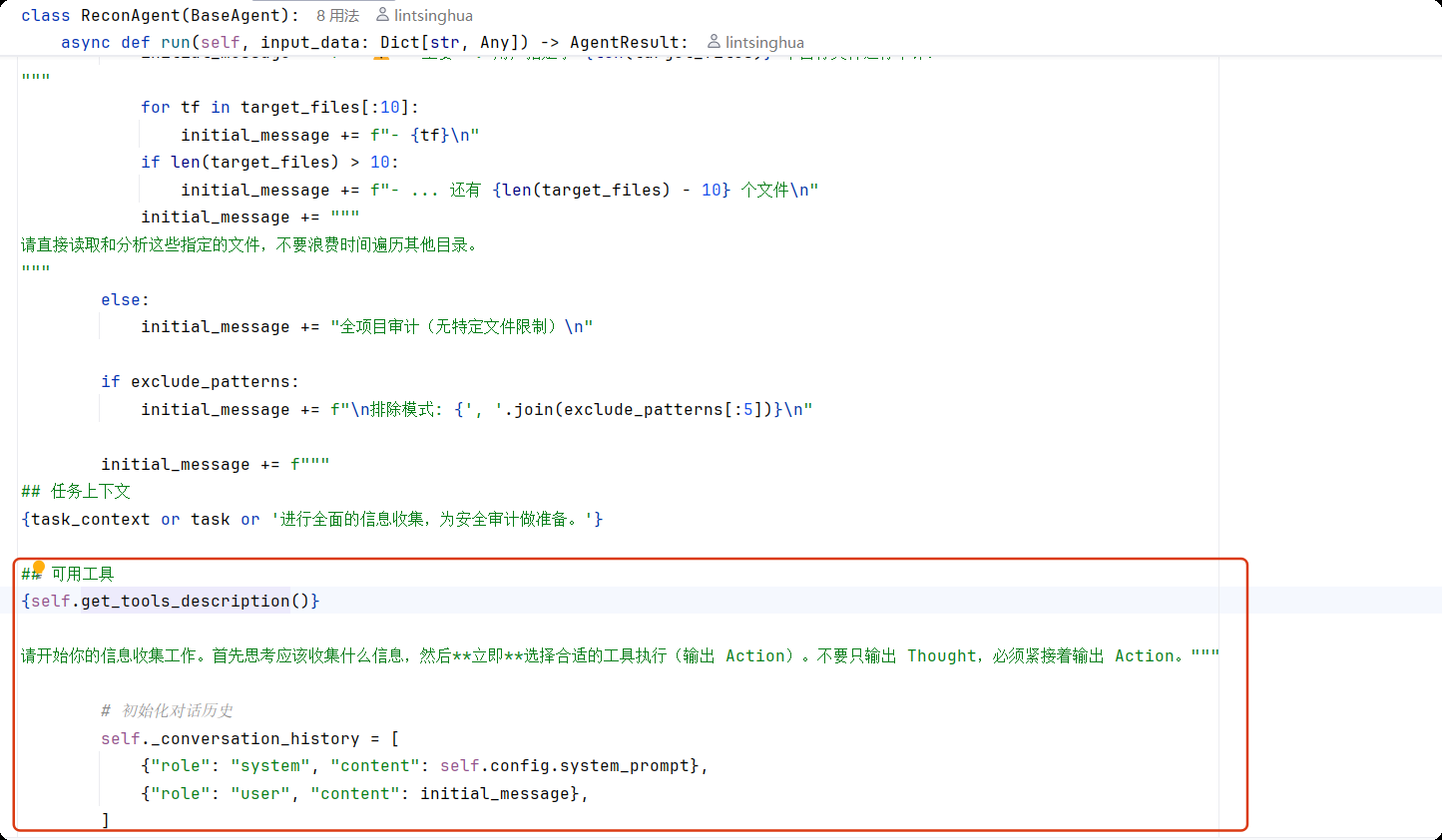 前面知道工具的调用会基于step去做,但是LLm还需要知道有哪些工具以及这些工具可以做什么才知道应该调用什么工具,在DeepAudit中是通过Agent初始化对话历史时加入所有工具描述实现的: