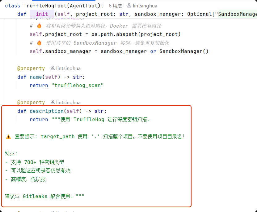 由于扫的是java+nodejs项目,明确用于python的工具没有使用,而Gitleaks和trufflehog_scan这两种工具只调用了前者,尽管trufflehog_scan的工具描述建议与Gitleaks搭配使用: