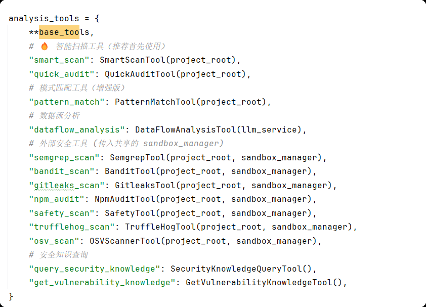Analysis调用了read_file、semgrep_scan、gitleaks_scan、smart_scan、pattern_match、dataflow_analysis、 security_search、search_code、think、reflect,有三种没调用