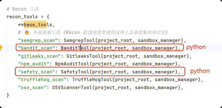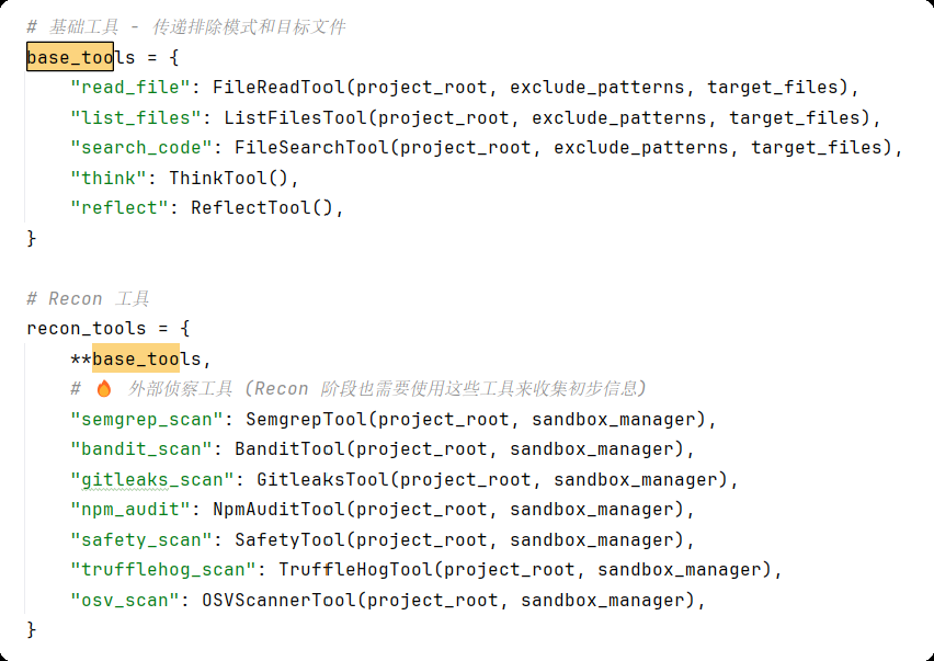 Recon调用了list_files、semgrep_scan、gitleaks_scan、npm_audit、 osv_scan、rag_query、search_code、think,Recon工具: