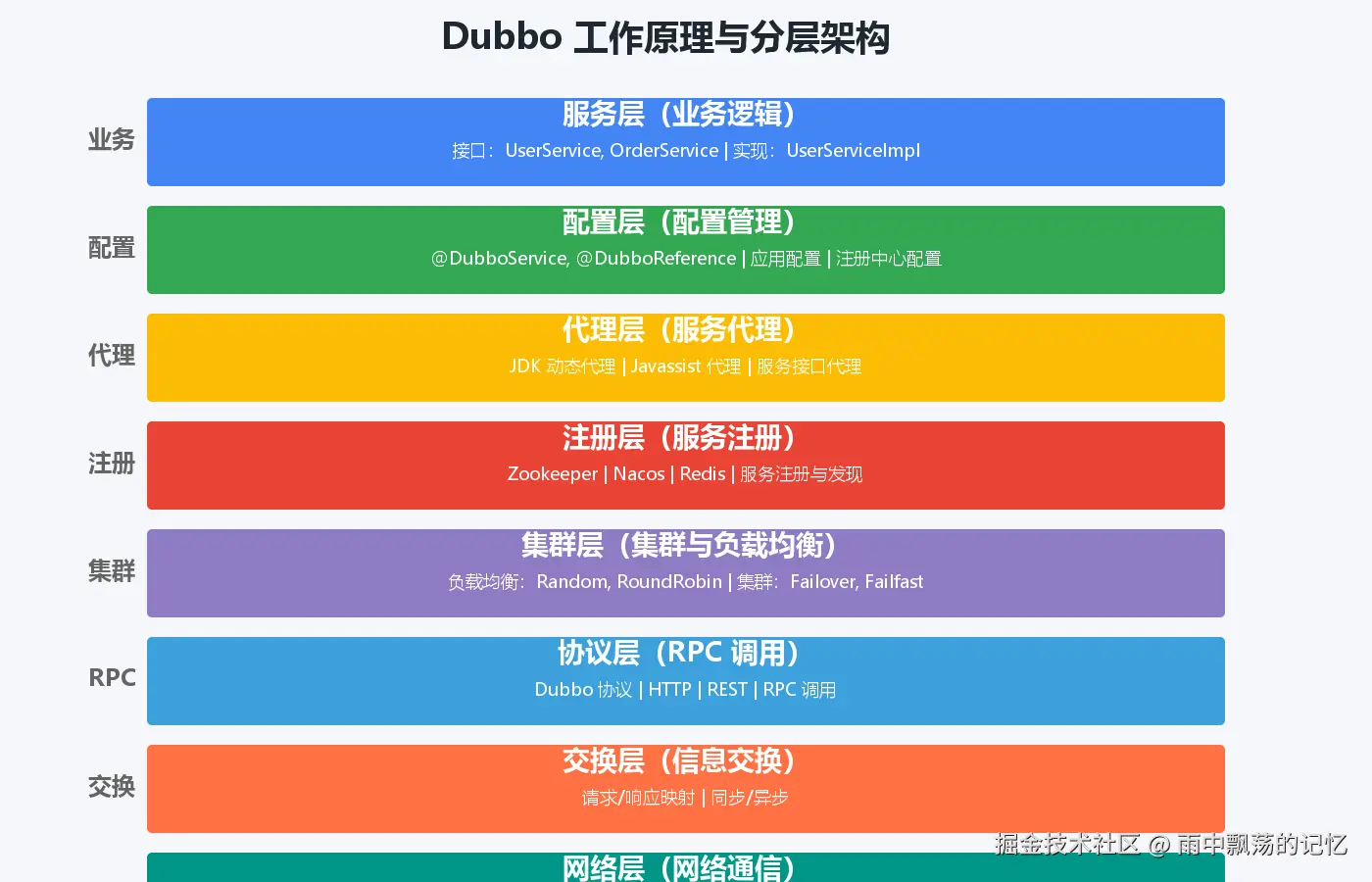 这种分层设计使得Dubbo具有良好的扩展性,每一层都可以独立替换和优化。