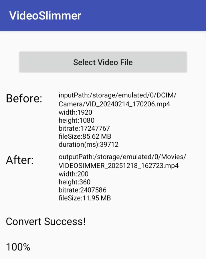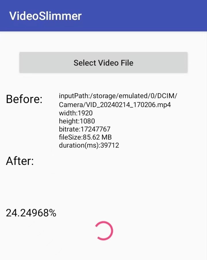 完成以上三处修改后,重新编译App安装到真机上,挑选一个视频后进入视频压缩界面如下图所示: