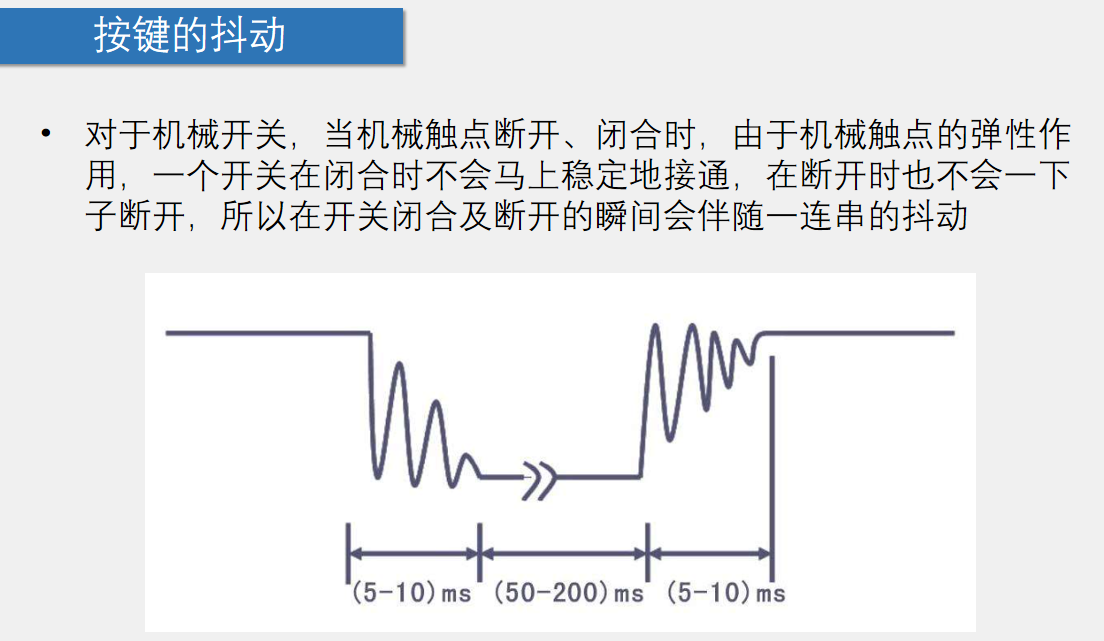 由于机械点的弹性作用,按键开关在闭合时不会马上稳定的接通,在断开时也不会一下子断开。因而在闭合和断开的瞬间均伴随着一连串的抖动。抖动时间的长短由按键的机械特性决定,一般为5ms到10ms。