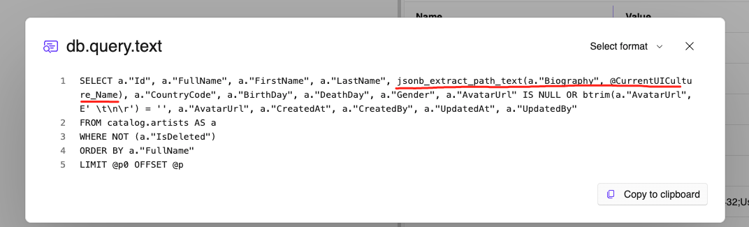 虽然存储方便,但在读取时会面临流量和性能问题。在大多数业务场景中,前端仅需要展示当前用户语言(如英语)的内容。如果直接查询实体,EF Core会将包含所有语言的JSONB对象完整加载到内存中。对于包含几十种语言的长文本字段,这不仅浪费数据库 I/O,也增加了网络传输开销。
