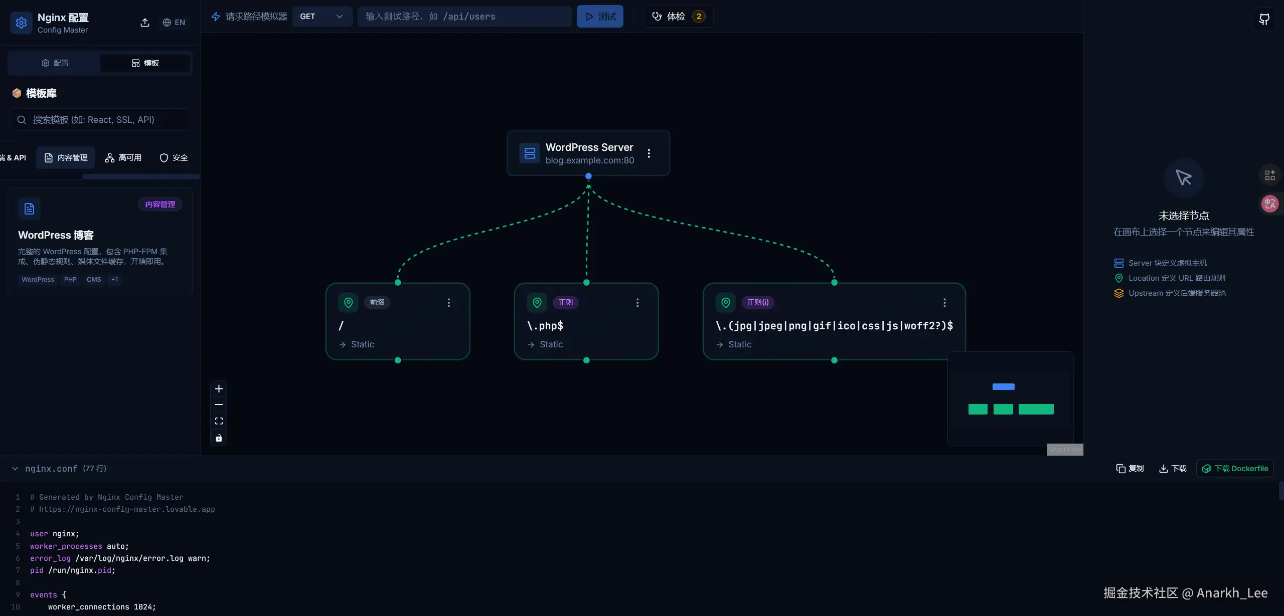 可以通过直观的拖拽式画布界面,帮助运维工程师和开发者快速构建、调试和优化 Nginx 配置,减少繁琐的手写配置和语法错误。