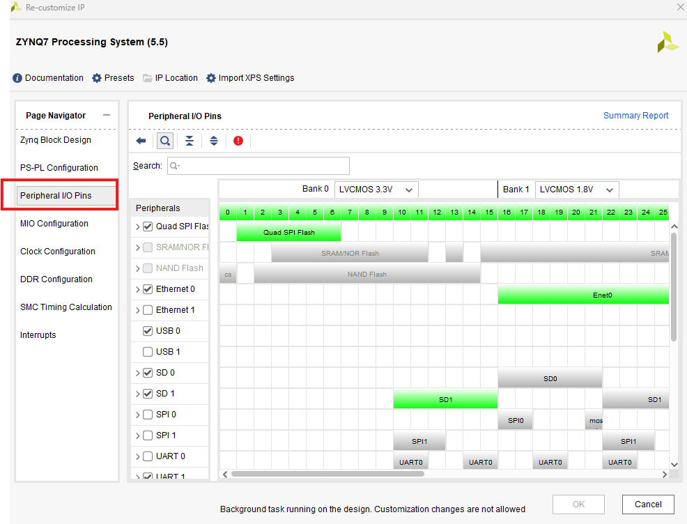 Peripheral IO Pins 页面用于为不同的 I/O 外设配置相应 MIO/EMIO 配置。