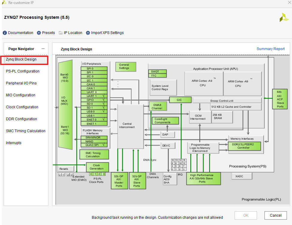 Zynq Block Design 页面显示了 PS 端的各种可配置块,其中灰色部分是固定的,绿色部分是可配置的,单击可配置块,可以进入相应的配置页面。