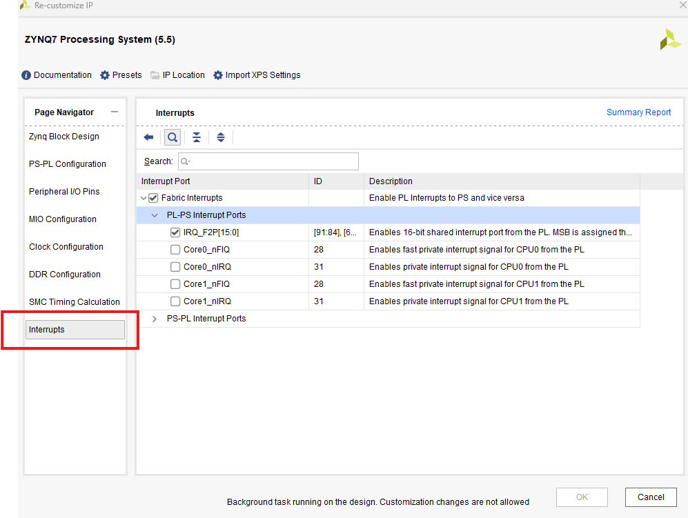 Interrupts 页面用于配置 PS-PL 中断端口。