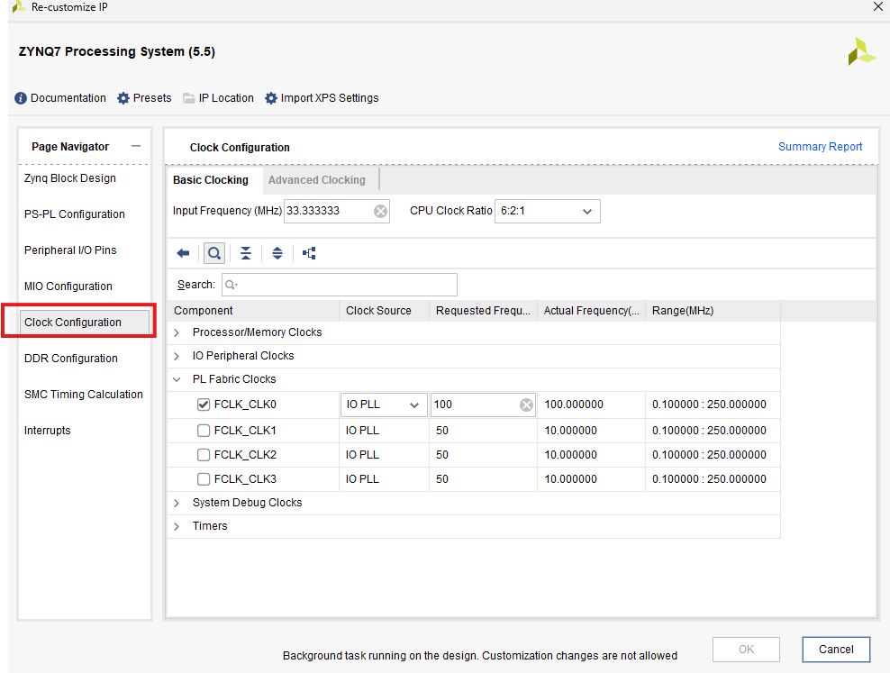 Clock Configuration 页面用于配置处理系统 7(Processing System 7) 的外设时钟、逻辑单元时钟、DDR 和 CPU 时钟。