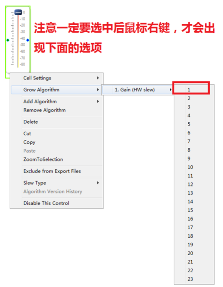 3)选中并鼠标右键点击刚加入的 Single 1 模块, 选择弹出菜单里的 Grow Algorithm>1. Gain (HW slew) >1, 使其支持双声道处理。并将 input 与其链接。