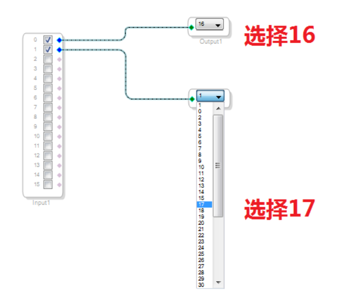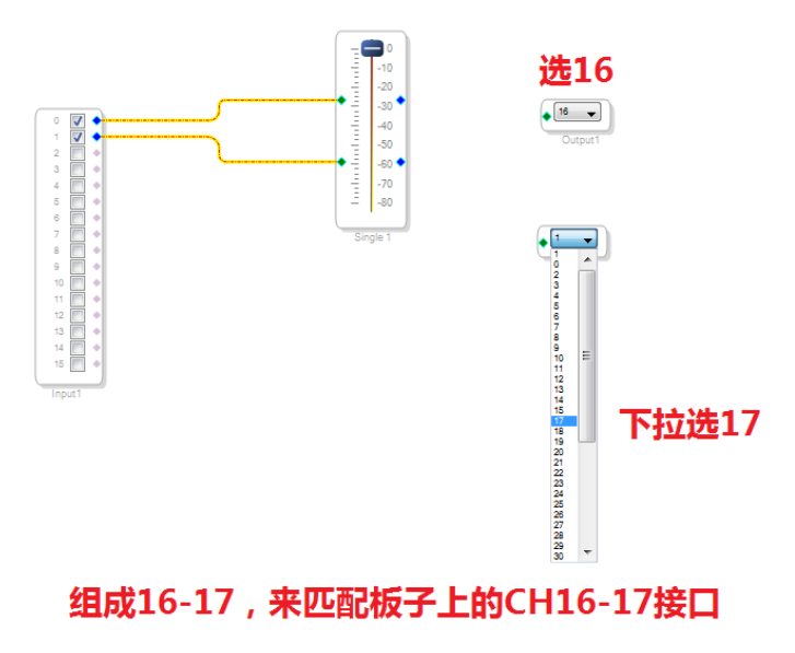 先将 output 的通道选择好, 0/1 是一组, 16/17 是第二组。