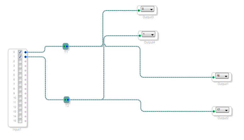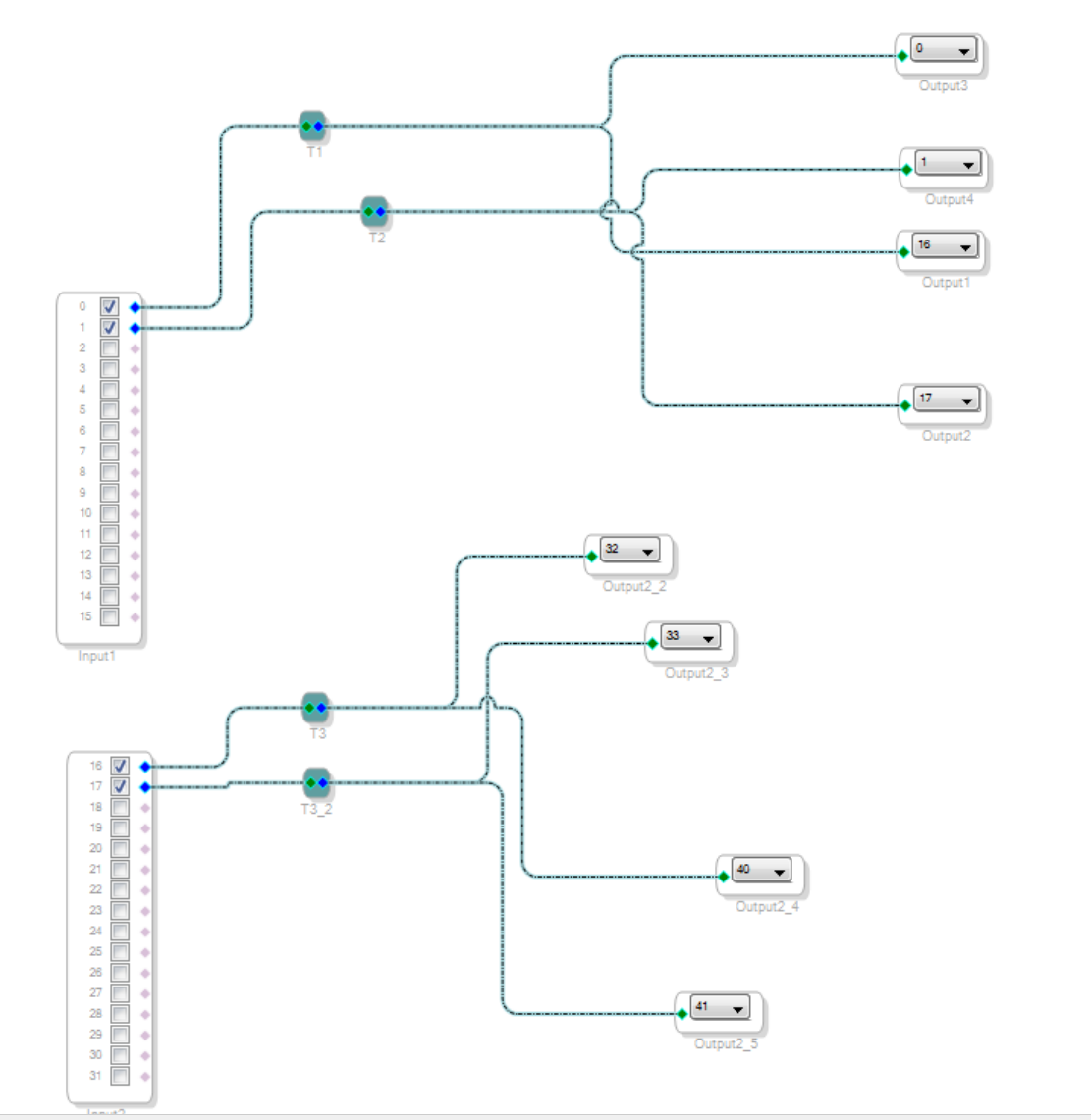 于是问题来了,输入接口只有 2 个点,如何才能跟 4 个 output 相连呢,这里我们需要引入一个非常重要的模块,T。T 可以让他们并联起来。