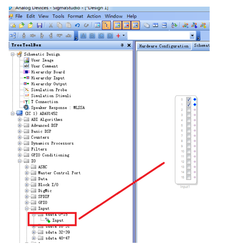 2)首先设计 Input,同样是将左边的 input 拖到右边。Tree Toolbox, 点开 IO 模块组, 然后选择 Input 模块中的 sdata0-15(因为我们要用到开发板上的 IN0-1) , 并将其拖到右边的空白工作区;