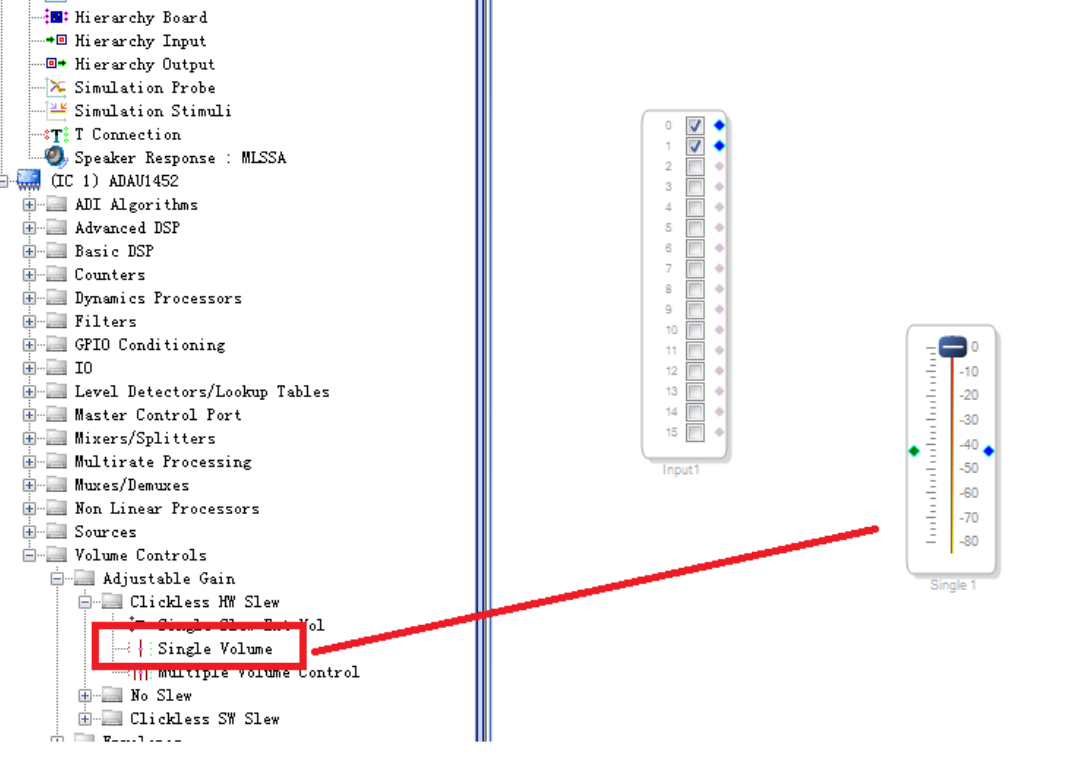 2)设置一个音量控制,点开 Volume Controls 模块组,然后依此选中/点击 Adjustable Gain >Clickless HW Slew, 再把其中的 Single volume 模块拖到工作区。