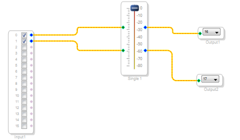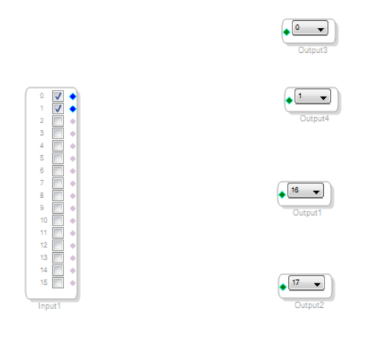 0/1 输入后接输出接口 0/1 和 16/17,两个立体声(四出)输出