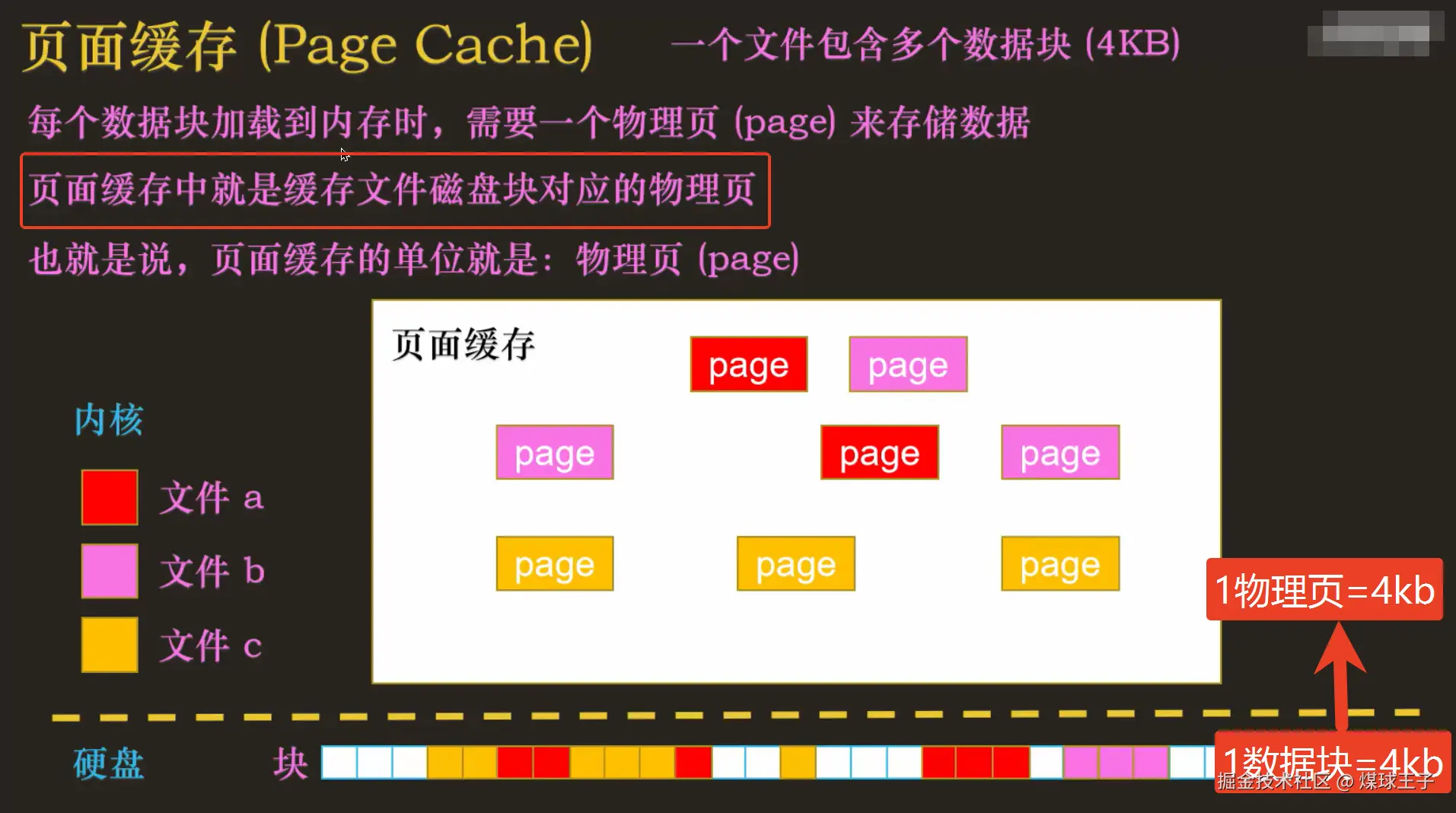 答:一个文件包含多个数据块(4KB), 每个数据块加载到物理内存时,需要一个物理页(page), 来存储数据,也就是说,页面缓存的单位就是:物理页(4KB page)