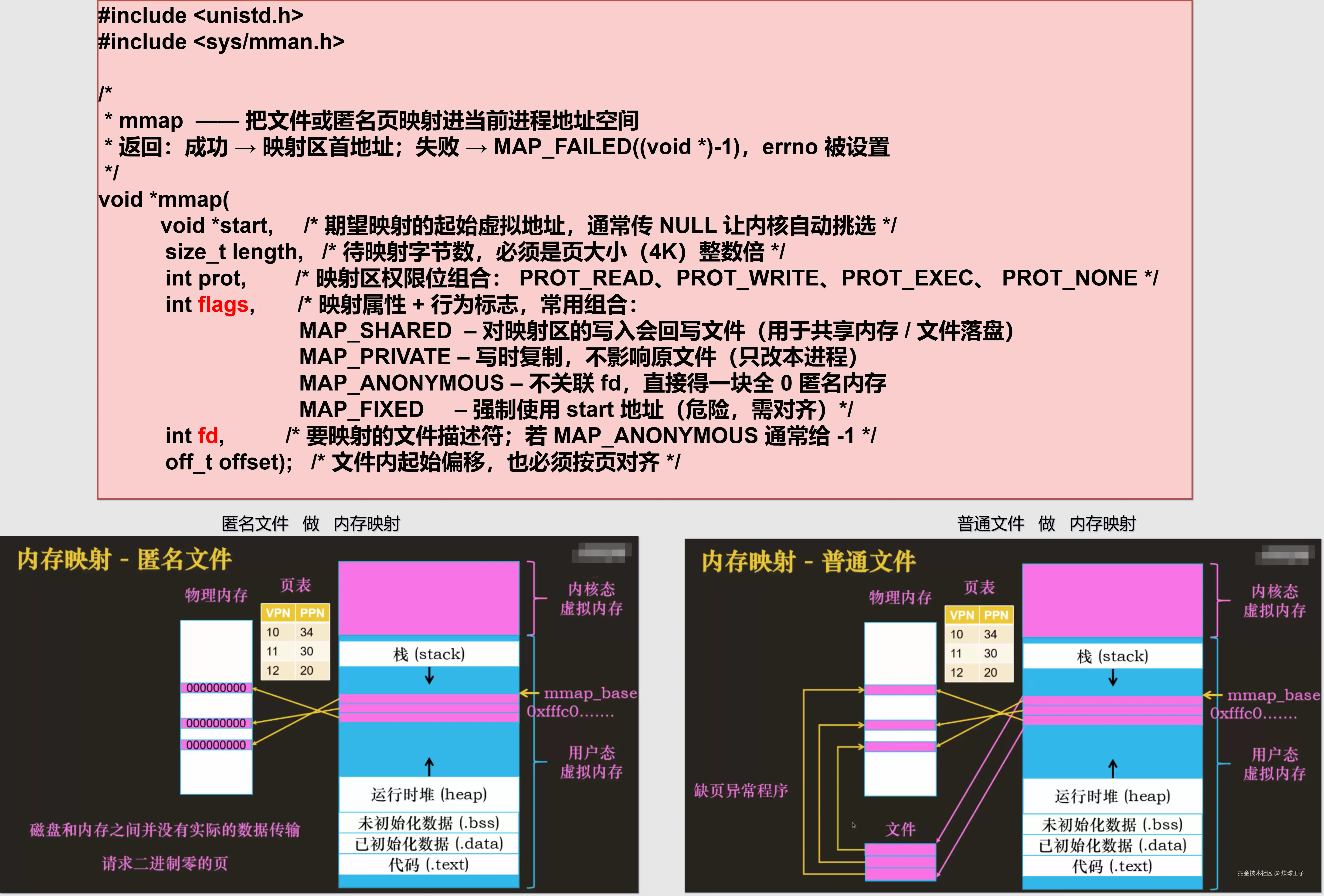* 返回:成功 → 映射区首地址;失败 → MAP_FAILED((void *)-1),errno 被设置
