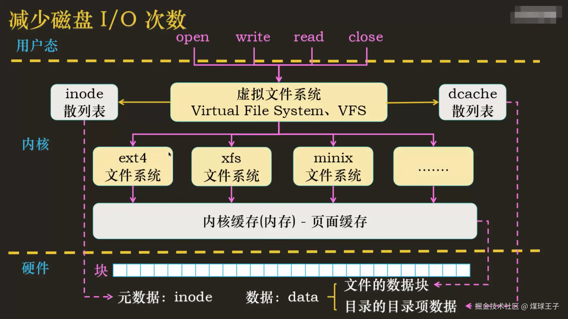 inode散列表: 缓存__元数据信息dcache散列表: 缓存__目录的目录项数据信息页面缓存: 缓存__文件的数据块信息