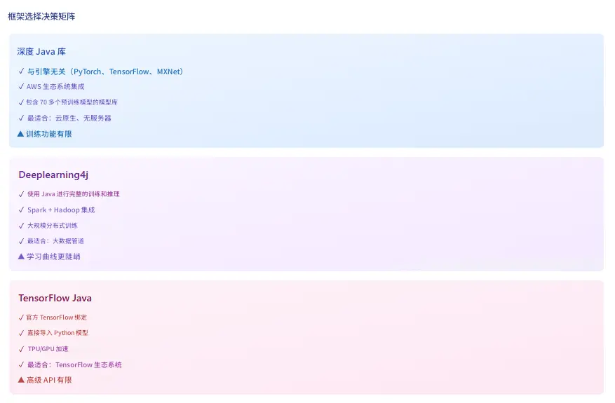 框架选择取决于上下文:DJL 在推理和模型服务方面表现出色,具有引擎灵活性,是云原生微服务的理想选择。DL4J 提供了与大数据框架集成的完整 ML 生命周期功能,适用于需要分布式培训的组织。TensorFlow Java 服务于深度投入 TensorFlow 生态系统、需要直接模型兼容性的团队。