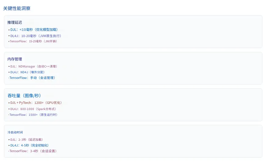 内存管理区分了框架:DJL 的 NDManager 解决了管理 JVM 应用程序中本机内存的关键挑战,实现了 100 小时以上的生产运行而无内存泄漏。这种生产就绪性将企业可行的框架与实验性绑定区分开来。
