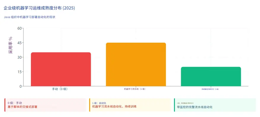 MLOps 成熟度参差不齐:只有 20% 的 Java ML 部署达到了 Level 2 CI/CD 成熟度,具备自动重新训练和监控。机会在于将已建立的 DevOps 实践------容器、编排、可观察性------应用于 ML 工作流。