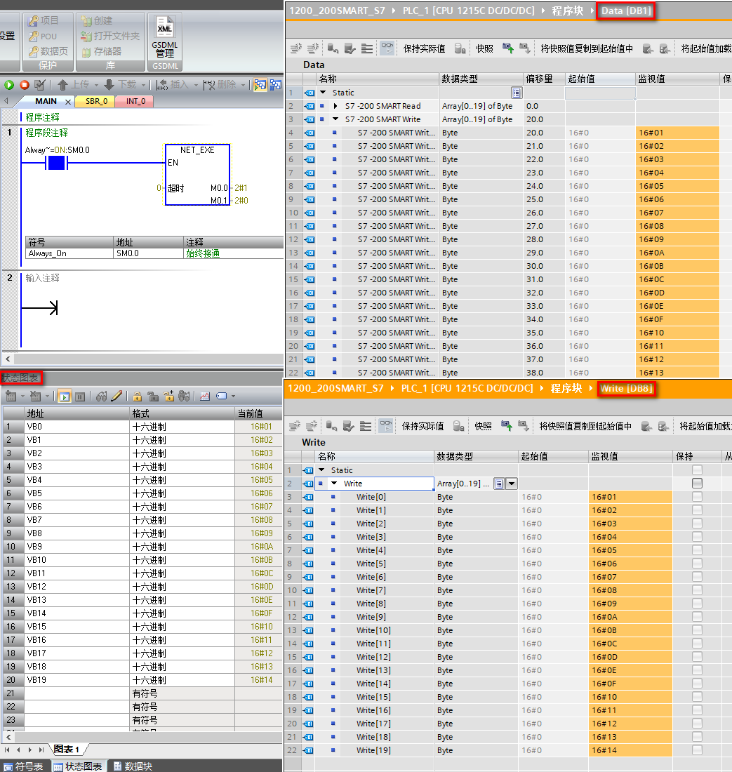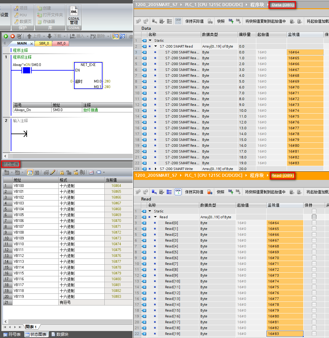 至此,S7-200 SMART 作客户端与 S7-1200 进行 S7 通信的组态和编程就完成了。