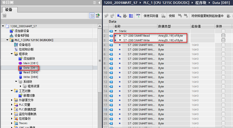 依据要求,创建 DB 数据区,并建立相应数组,分别命名为 Write、Read,如图 2 所示。
