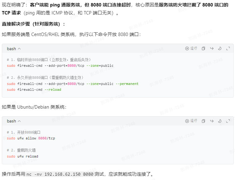 豆包回复"核心原因是服务端防火墙拦截了 8080 端口的 TCP 请求"